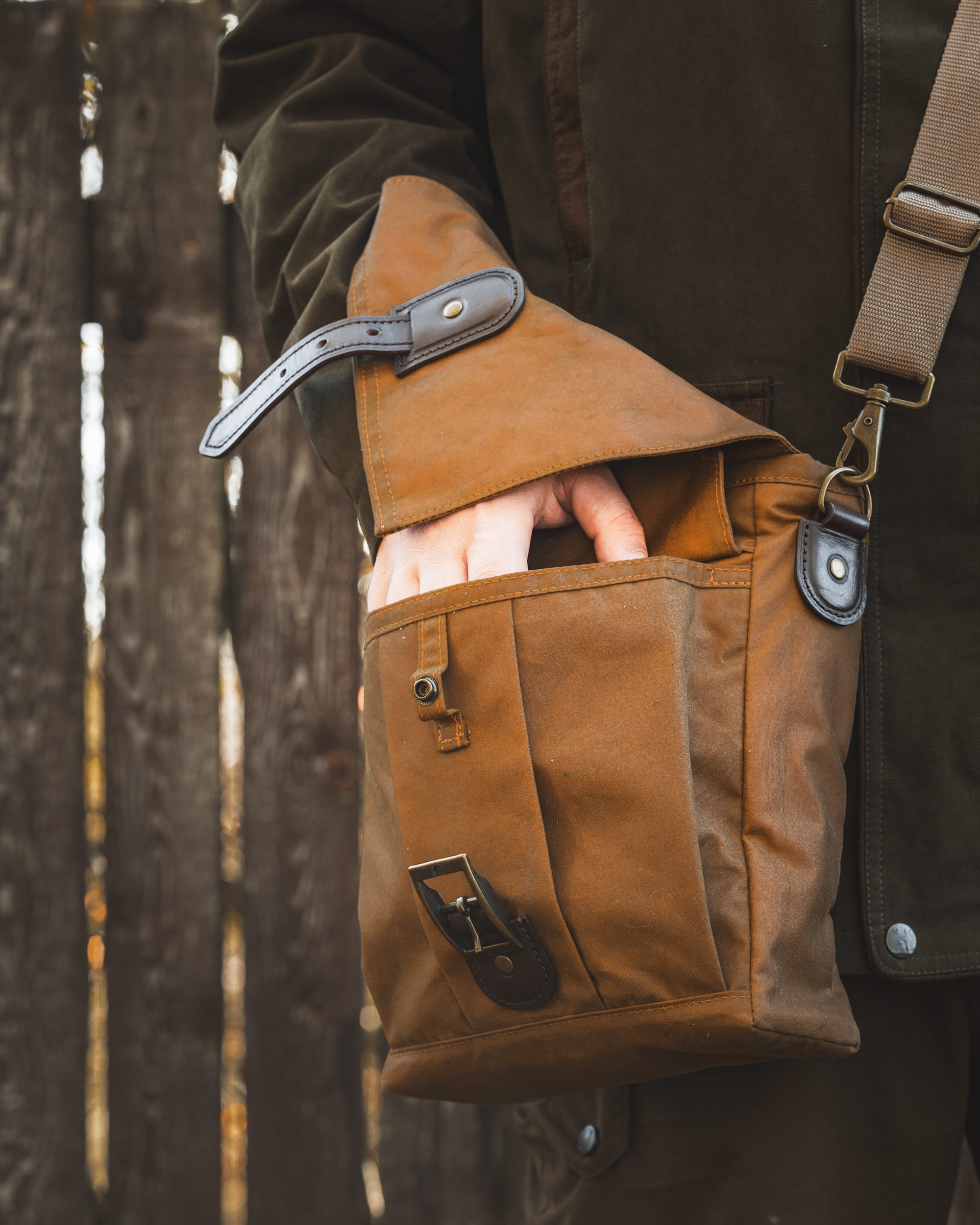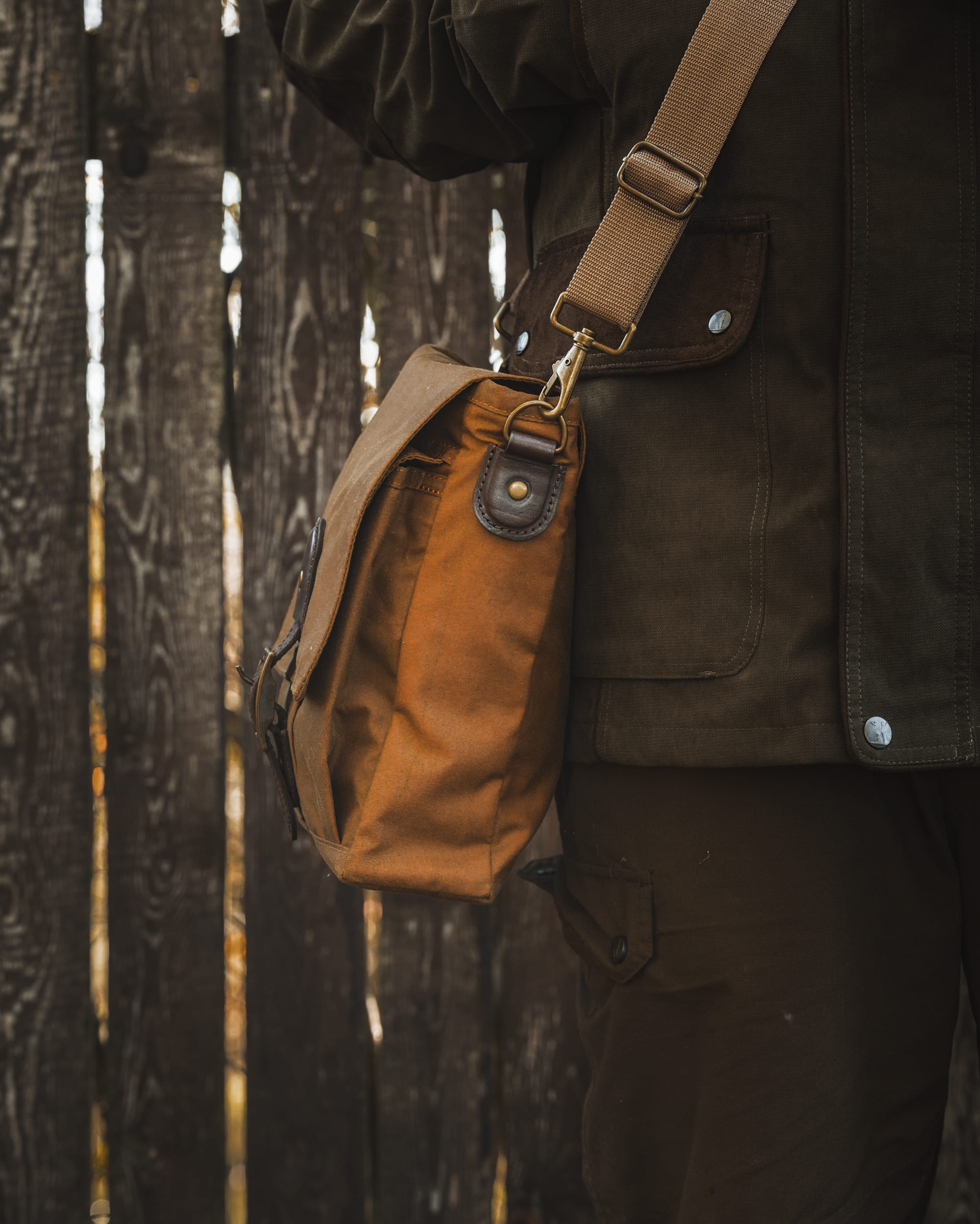 This oilskin canvas field bag is crafted from durable dark-beige canvas treated with natural oils for long-term water resistance and that unmistakable rugged character. Designed for both daily use and life outdoors, it balances traditional charm with modern practicality.